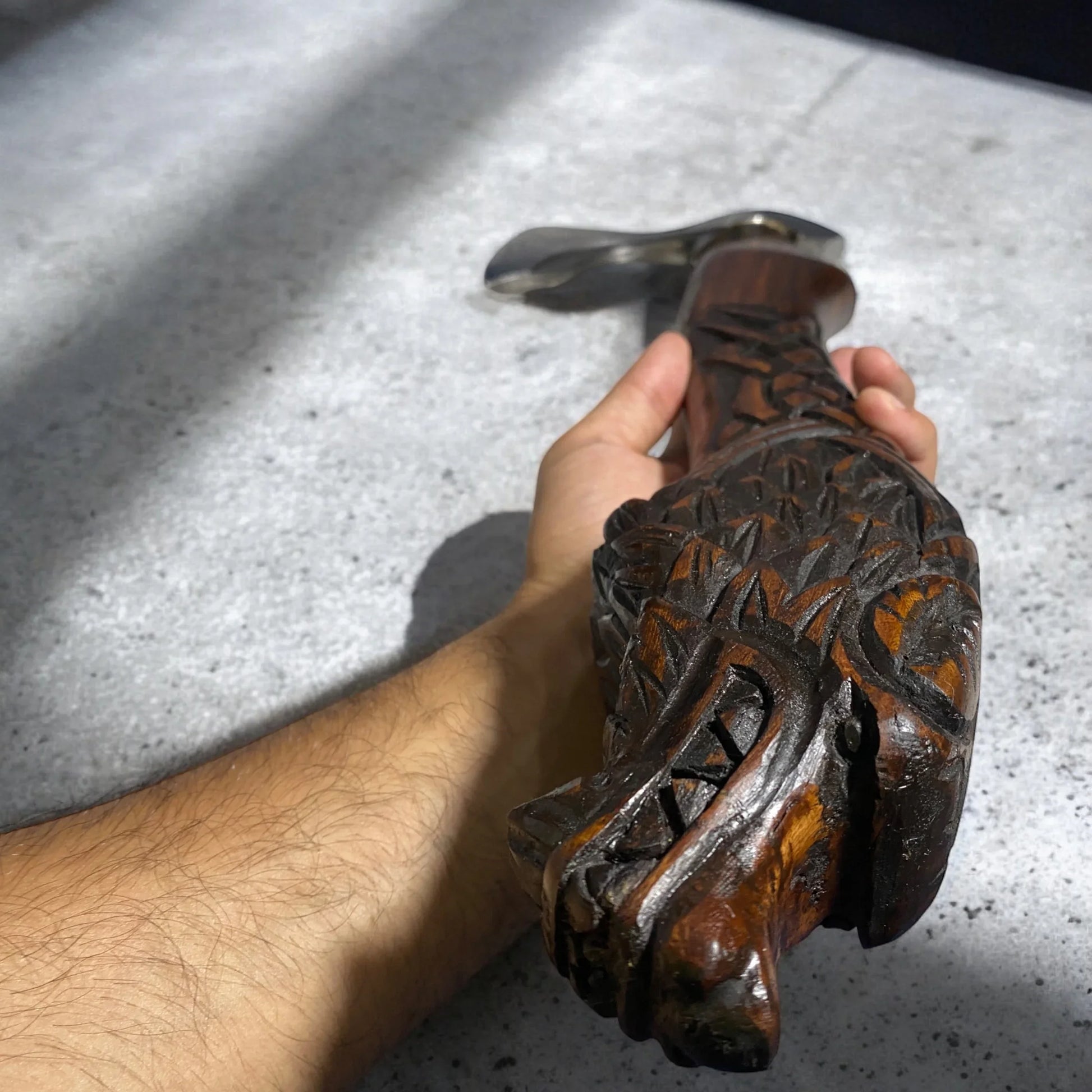 This handmade Viking-inspired axe features a durable etched steel head and a meticulously handcrafted wooden handle for authenticity and comfort. It comes with a leather sheath for safe storage and transport, making it perfect for collectors, historical displays, or themed decor.